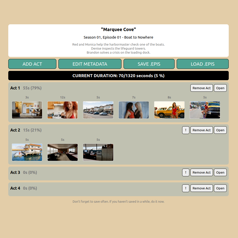 Organize compressed versions of your TV show reference images into acts and scenes to calculate show length and structure. Save your files to your local HDD.