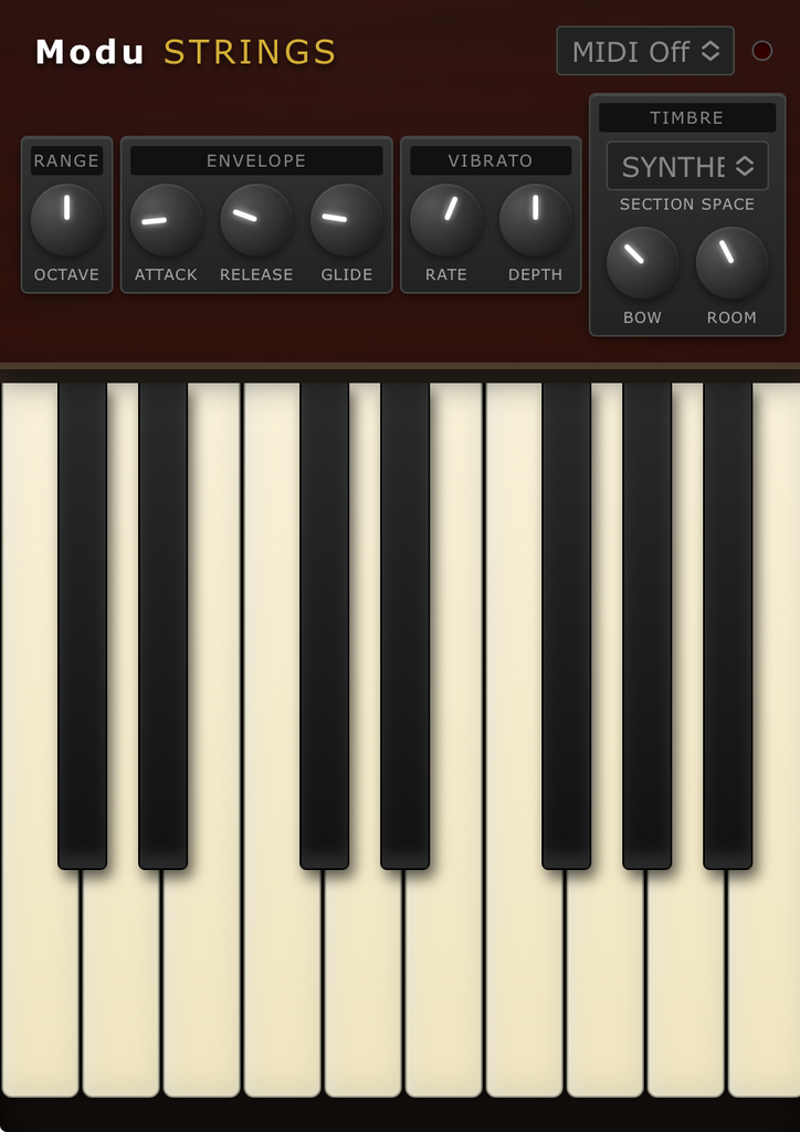 A quilcom-style modeled Strings instrument with on-screen playable keyboard mapped to the instrument. Has a Glide keyboard. This instrument utilizes free synthetic AI generated IR.