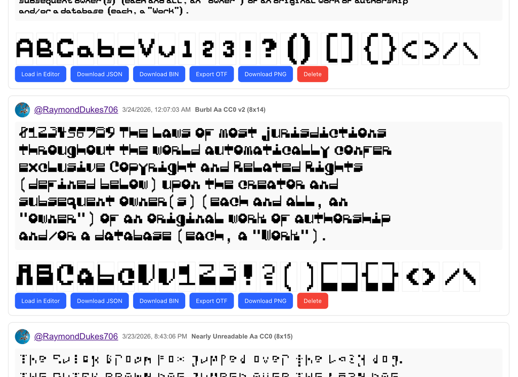 Based on my earlier project. This time, you can add your own fonts to the gallery, export and import fonts, and download any fonts from the gallery. Custom #Font Maker. Create your own fonts. Any fonts submitted should be considered CC0. You can now export OpenText Fonts from the gallery submitions. (*.OTF fonts) They should work in many programs like TrueType fonts.