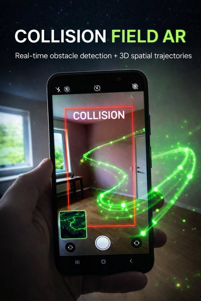 AR app that senses your surroundings in real time. It detects walls, floors, furniture, and other obstacles, showing red-edge warnings and vibrations when you get too close. A live top-down mini-map displays local boundaries around you, helping navigate safely without building a global 3D map. It also renders your smartphone’s real-time motion as 3D spatial trajectories suspended in space.